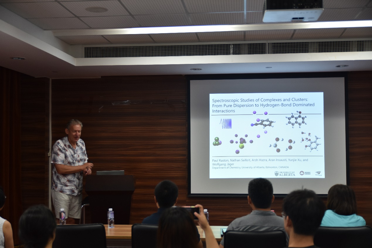 Wolfgang教授指出,转动光谱技术与高水平理论计算相结合是研究分子团簇和弱相互作用复合物的一种有力方法,通过实验得到的光谱常数可以得到关于团簇的结构、相对能量以及分子间和分子内动力学的重要信息,该技术的优势在于其超高的光谱分辨率和灵敏度,能准确识别分子的包括键长键角在内的几何结构和分子构型的微小变化,包括由于量子隧穿效应导致的光谱裂分,这是其他光谱技术不能实现的。Wolfgang教授团队利用微波转动光谱技术研究了以色散相互作用结合的稀有气体团簇、稀有气体和芳香环分子以及含强氢键的芳香环-水复合物等体系,探究不同体系中分子间相互作用的类型和强度变化,如在OSC-氦气纳米团簇中发现随着He原子数目的增加表现出超流体的特征,萘酚二聚体中的π-π堆积相互作用,过氧化氢-甲酸团簇中过氧化氢氢原子的自由转动引起的量子隧穿效应等。Wolfgang教授还提到,对分子团簇的结构研究关系到物理和化学的多个过程,例如,利用高分辨微波光谱解析得到的团簇结构可作为评估电子结构计算准确性的基准,同时利用实验确定的不同尺寸团簇结构有助于研究体系从单分子到团簇再到体相的转变,也为研究溶剂化效应和气溶胶颗粒的形成过程提供有力的支持。Wolfgang Jäger教授的报告生动有趣,激起了与会师生的广泛兴趣并进行了热烈讨论。