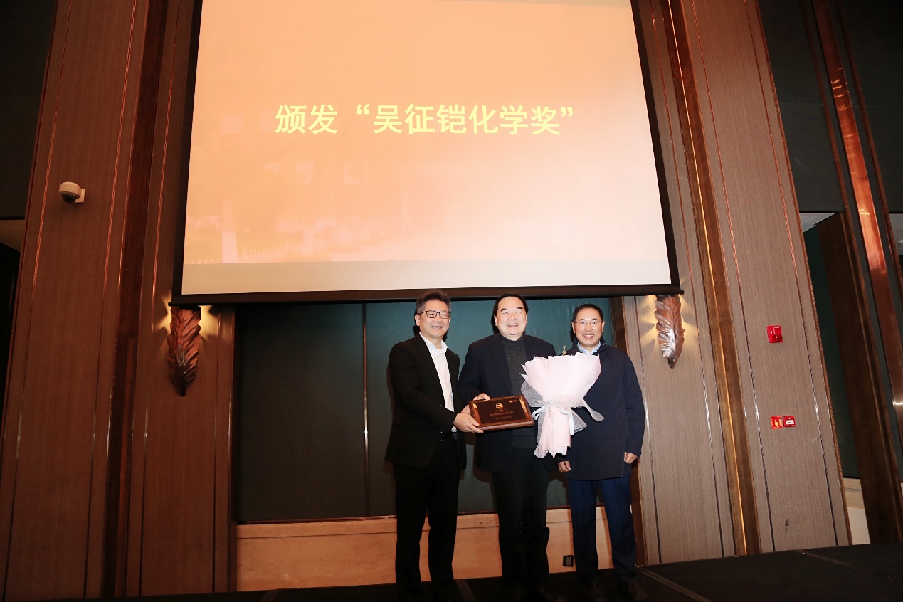 报告会由人妻-丰满人妻直播 系主任周鸣飞教授主持。为了表彰包信和院士在催化科学领域做出的卓越贡献,近思讲坛组委会决定授予包院士“吴征铠化学奖”,蔡彤先生和谭瑞清先生为包院士颁发了奖牌。