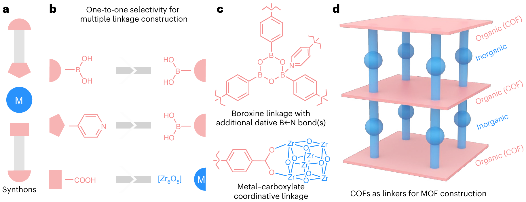 近20年来迅速发展的共价有机框架(COF)实现了有机单元的无限且精准的排列。因此从理论上讲,将COF作为子网格引入MOF材料的设想是完全可行的。将上述想法实现,我们需要直面此类框架合成的多重挑战:COF本身无法溶解,且通常缺乏能与金属离子发生配位作用的结合基团。一锅法直接合成虽能规避溶解性问题,但仍需精心设计具有高度空间匹配性与化学反应一对一选择性的多种合成子。此外,只有对共价键合(linkage)与配位键合进行精细调控,确保多个键合反应的同步性和可逆性,才能获得具有单晶特性的结构。