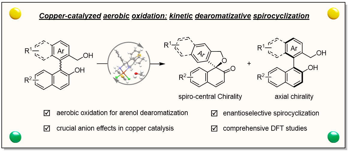 近日,人妻 朱灿课题组发展了一种新型的空气氧化体系:以氧气作为终端氧化剂,阴离子辅助铜/手性二胺催化轴手性萘酚发生动力学去芳构化螺环化转化,同时高效获得光学活性的轴手性苄醇与手性氧杂螺环化合物,去芳构化转化展示了良好的对映选择性。