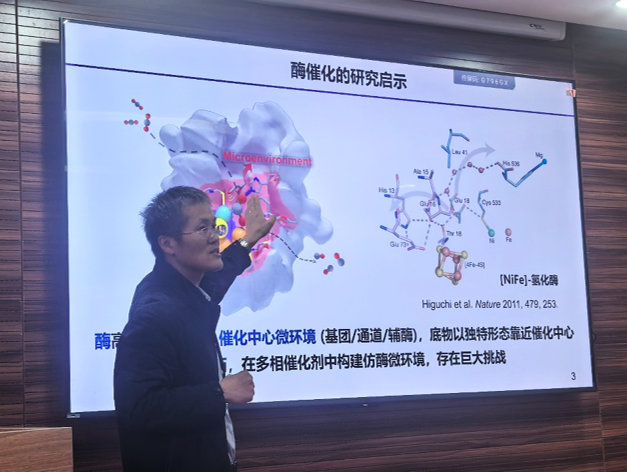 中国科学技术大学江海龙教授作题为“催化中心微环境的化学调控”的学术分享。江教授从酶催化的研究启示指出,催化反应的高性能不仅依赖催化中心本身,其周围的微环境也起到关键作用。在多相催化体系中,理解这一微环境效应仍面临巨大挑战。江教授介绍了框架材料(MOFs/COFs)在构建仿酶催化中心方面的独特优势,强调通过原子精度可控的结构调节,可实现多变微环境的构建,从而为多相催化剂的设计、合成和性能优化提供重要参考。