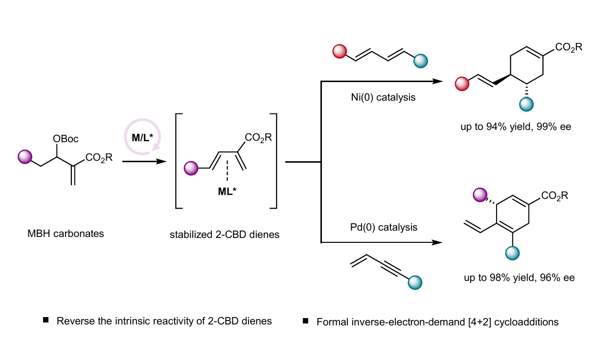 近日,人妻-丰满人妻直播 蔡泉课题组发展了配位稳定/促进环化策略,首次实现了这一转化。研究团队利用简单易得的Morita–Baylis–Hillman碳酸酯为双烯前体,在Ni(0)/手性单膦配合物催化下,原位生成不稳定2-酯基-1,3-丁二烯,并利用低价镍金属催化剂的配位作用稳定二烯,随后与外加1,3-共轭二烯发生选择性氧化环金属化及还原消除反应,以优异的化学选择性、区域选择性、及立体选择性成功实现了一系列对位取代环己烯类衍生物的高效合成。该策略可进一步拓展至钯催化体系,实现了Morita–Baylis–Hillman碳酸酯与1,3-烯炔的不对称形式反电子需求[4+2]环加成反应。在该反应中,1,3-共轭烯炔的炔烃区域选择性地发生反应,从而为多取代手性 1,4-环己二烯衍生物的不对称高效合成提供全新方法。以该反应为关键步骤,研究团队以三步反应实现了保幼酮和表保幼酮的简洁不对称合成。机理实验及密度泛函理论计算研究表明,反应经历了分子间[4 + 4 + 1]型氧化环金属化过程及还原消除反应机制。