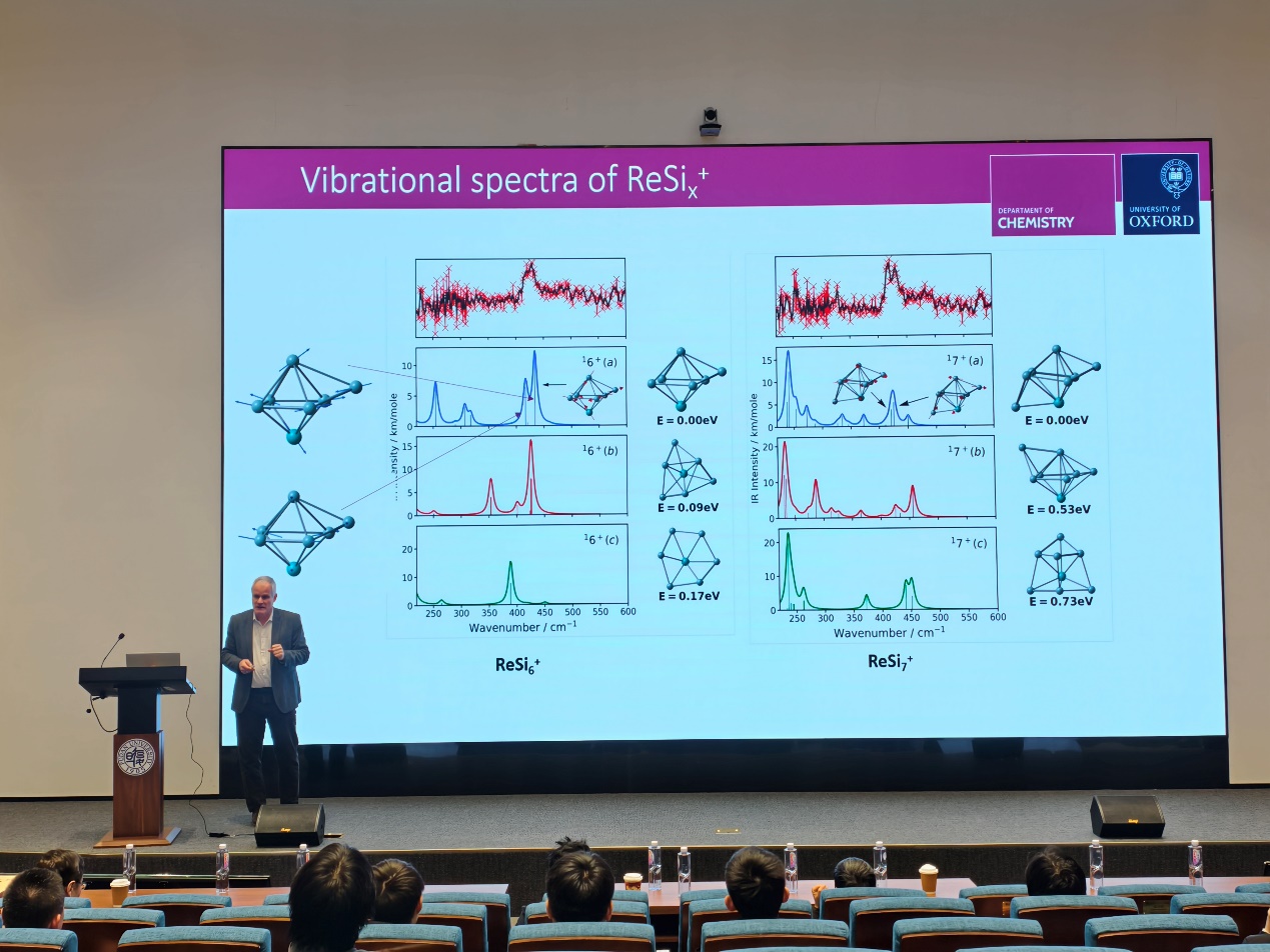 John E. McGrady教授分享了课题组在团簇生长机制及其理论研究方面的最新研究成果,系统阐述了团簇生长过程在连接分子化学与纳米材料研究中的关键作用,并指出理解团簇从单个原子逐步演化为复杂二元及三元物相的生长路径具有重要意义。报告重点介绍了团簇生长的两种基本模式,即通过逐个原子添加实现的“原子逐个生长”过程,以及由预先构建的团簇片段经氧化偶联而发生的“团簇融合”过程。围绕上述生长机制,McGrady 教授进一步详细讲解了其团队近年来利用密度泛函理论、多组态自洽场理论及半经验方法等理论计算手段开展的相关研究工作,旨在为团簇生长领域中结构特征与光谱数据的理解与解析提供系统的理论框架。