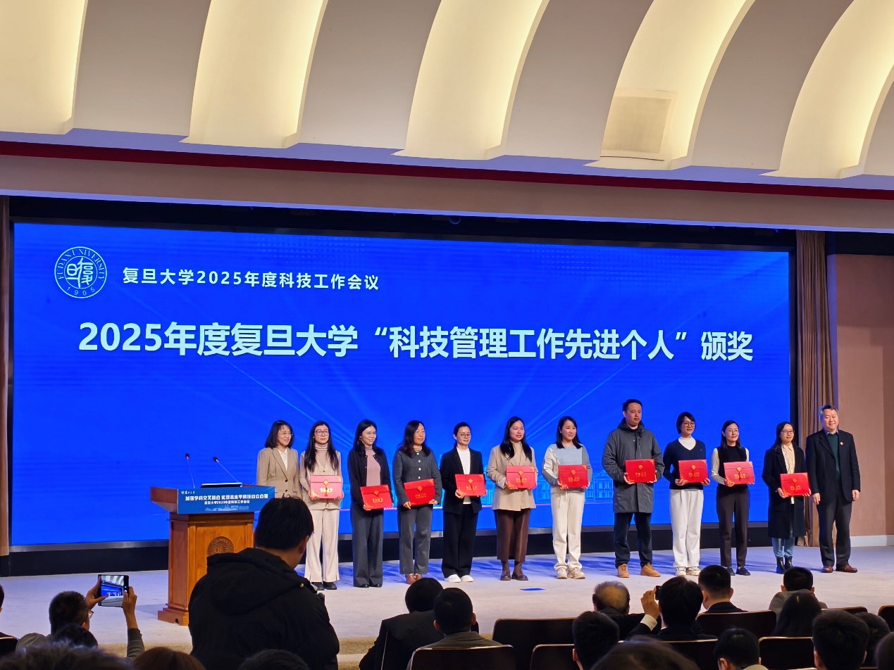 时值“十四五”规划圆满收官、“十五五”发展蓝图谋篇布局的关键节点,为深入学习贯彻党的二十届四中全会精神,全面落实习近平总书记关于科技创新的系列重要论述,进一步强化学科交叉融合发展,系统部署学校未来科技创新重点任务,凝聚全校科创共识、汇聚协同发展合力,奋力开创学校科技事业高质量发展新局面,2026年1月16日,复旦大学2025年度科技工作会议在邯郸校区光华楼东辅楼202吴文政报告厅隆重召开。本次会议全面总结学校2025年度科技工作成效,表彰在科技管理工作中表现突出的先进集体与个人,为后续科创工作开展明确方向、凝聚力量。会上,人妻 凭借规范高效的管理举措、扎实丰硕的科创管理成果,荣获“2025年度复旦大学科技管理工作先进单位”称号;我系李伟红老师因在科技管理工作中履职尽责、实绩显著,获评2025年度复旦大学“科技管理工作先进个人”。