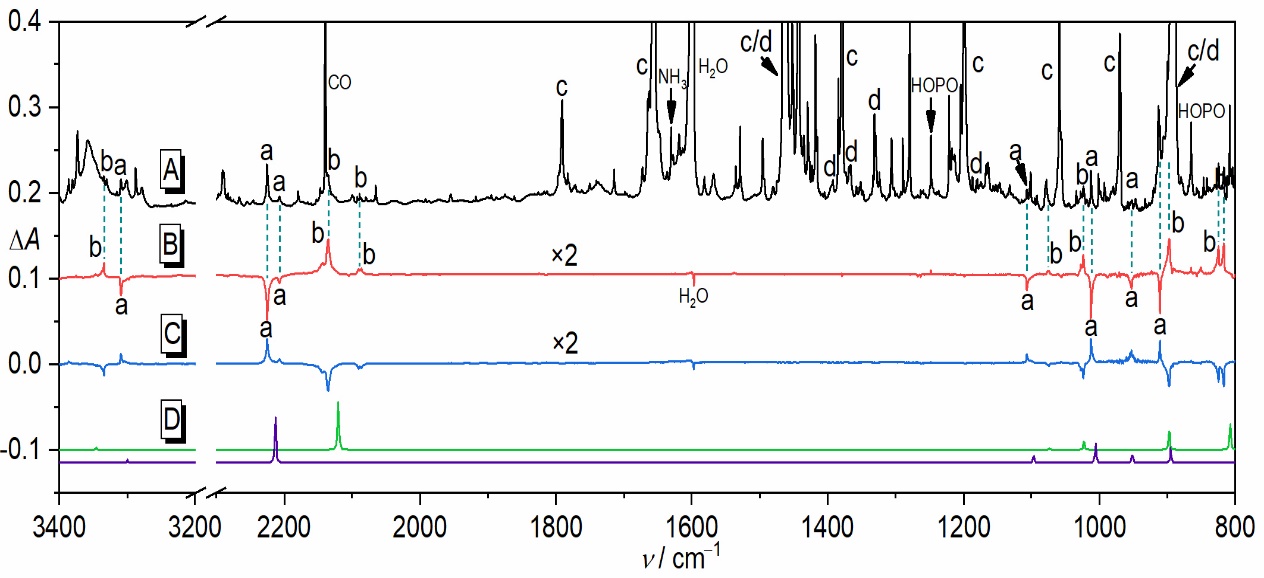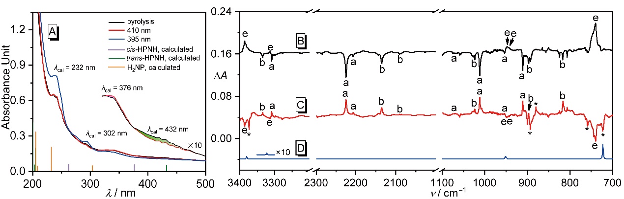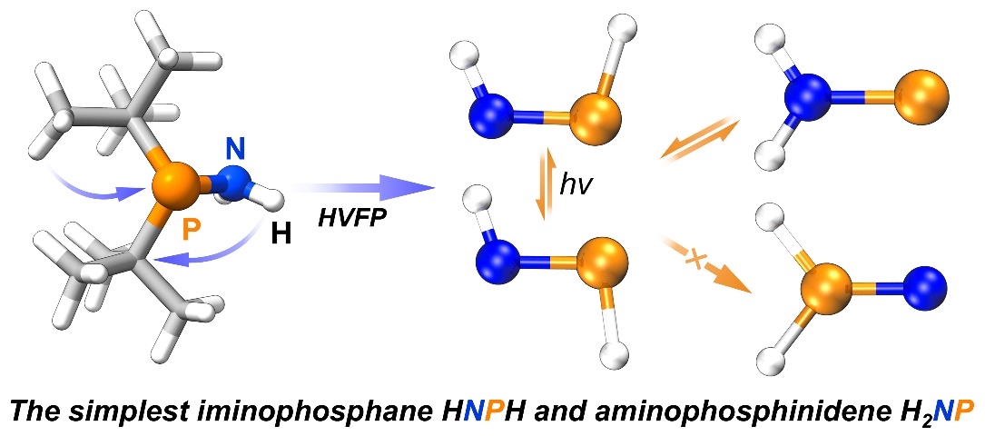 近期,人妻-丰满人妻直播 曾小庆教授、王丽娜副研究员团队通过自主研制的高真空闪光热解HVFP装置,以二叔丁基磷胺为前体,气相高温热解(~950 K)成功制备了HPNH。结合基质隔离红外和紫外可见吸收光谱表征、同位素标记实验和高精度理论计算,证实HPNH存在顺、反两种构象异构体,首次获得其指纹光谱数据。进一步通过选择性光激发,诱导两种构象之间的可逆转化。