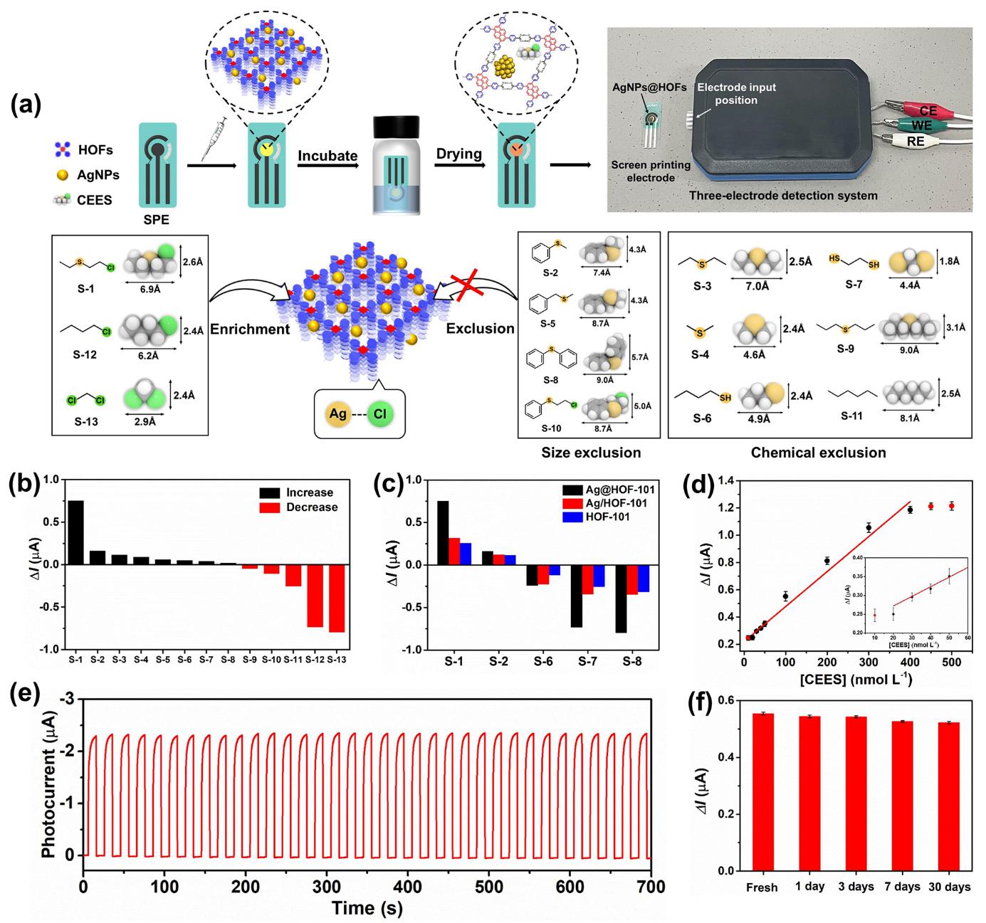 近日,人妻-丰满人妻直播 李鹏课题组合成了一类银纳米颗粒负载的氢键有机骨架(AgNPs@HOFs)光电活性材料,与传统半导体以及MOF材料相比,这种AgNPs@HOFs材料展现出优异的光电转换能力。他们利用该材料构建便携芥子气模拟物2-氯乙基乙基硫醚(CEES)光电化学传感器,在对13种不同的芥子气模拟物测试中,传感器能快速、准确识别CEES,对CEES最低检测线低至15.8 nmol L-1,器件具有优异的重复检测能力(大于30次)与长期工作稳定性(30天),表明了这种器件在实际操作场景的应用潜力,而且为进一步发展具有超高灵敏度和选择性的新型硫醚类化合物传感器提供可能。相关研究工作日前以《Ultrafine Silver Nanoparticle Encapsulated Porous Molecular Traps for Discriminative Photoelectrochemical Detection of Mustard Gas Simulants by Synergistic Size-exclusion and Site-specific Recognition》为题发表于《Advanced Materials》上。
