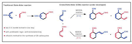 Diels−Alder反应于1928年首次报道,并于1950年获得诺贝尔化学奖,是有机合成化学中最重要的反应之一。传统的Diels−Alder反应发生在共轭二烯与烯烃之间,是合成六碳环的重要方法。然而,两种不同共轭二烯之间的交叉Diels−Alder反应由于周环选择性(periselectivity)的问题,会同时发生正电子需求和反电子需求的Diels−Alder反应,且区域选择性、立体选择性也往往较差,大大限制了其在合成中的应用。从合成的角度上看,若交叉Diels−Alder反应的周环选择性、区域选择性和立体选择性等一系列问题能得以克服,那么它将成为传统Diels−Alder反应的重要补充。然而,选择性的交叉Diels−Alder反应十分具有挑战性,是目前Diels−Alder反应研究领域的一个难点问题。