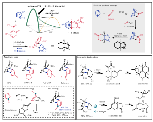 在该项研究中,蔡泉研究团队利用2-吡喃酮与非活化1,3-共轭二烯发展了一种罕见的具有‘两可’反应模式的不对称交叉Diels−Alder反应。在二价铜和手性噁唑啉配体的催化下,3-酯基-2-吡喃酮与多种取代的环戊二烯、环己二烯、富烯能发生高周环选择性、高对映选择性的不对称交叉Diels−Alder反应,发散性地合成系列六元环外带有额外双键的顺式并环结构。这种重要结构的合成过去需要通过Diels−Alder反应、1, 2-加成、3, 3-sigma重排等多步反应才能实现,且反应条件通常较为剧烈。利用该方法,研究者通过选择合适的环状共轭二烯底物,在温和的反应条件下生成高度官能团化的关键手性中间体,从而以简短的合成路线分别实现了抗疟药物青蒿素和植物生长调节剂冠菌素的高效形式不对称全合成,为这些重要活性分子的结构改造提供方法学和合成路线基础。