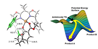 为了理解该对称交叉Diels−Alder反应的周环选择性和对映选择性调控机制,蔡泉研究组与加州大学洛杉矶分校的理论计算化学家K. N. Houk教授、加州大学洛杉矶分校/杭州师范大学的杨丽敏副教授合作,通过对照实验和密度泛函理论计算的手段研究了反应的历程和机理。研究的结果表明,该反应具有一种特殊的“两可”反应模式,即:反应经历一种ambimodal过渡态(“两可”过渡态),同时得到 [4+2](正电子需求)和[2+4](反电子需求)的环加成产物。由于这两种产物的形成经过了相同的过渡态,因此它们具有相同的绝对构型和ee值。随后,这两种环加成产物通过Cope重排反应过渡态相互转化,最终得到热力学稳定的反电子需求的环加成产物。